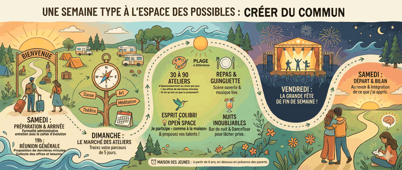 Consulte le programme : Disponible quelques mois avant sur espacedespossibles.com (planning détaillé 2 semaines avant) et présentation des chartes à suivre pour l’harmonie générale.